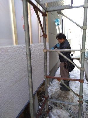現社屋と新社屋との渡り廊下のサイディング工事が行われました。