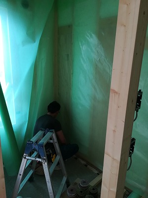 気密シート施工後は、壁ボードの施工に進んでいきます。