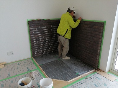 先週、薪ストーブ設置場所のタイル施工が行われました。