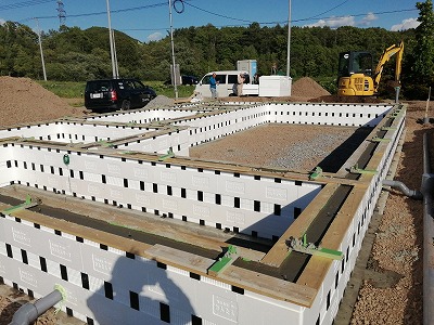 断熱型枠の取付作業が終わり、コンクリートミキサー車が入って