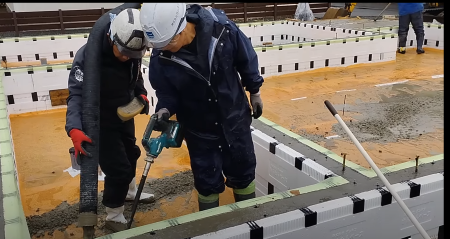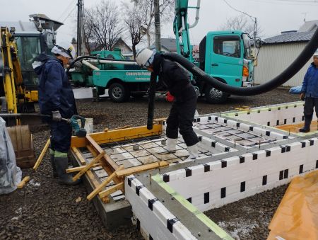 コンクリートミキサー車からホースでコンクリートを流し込んでいきます。