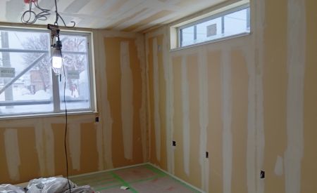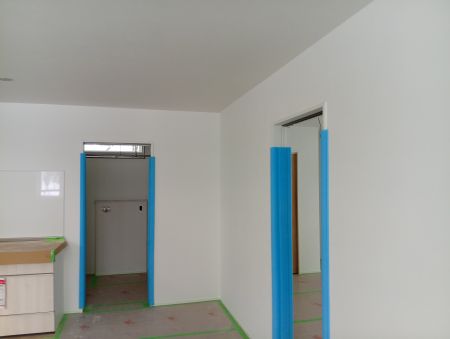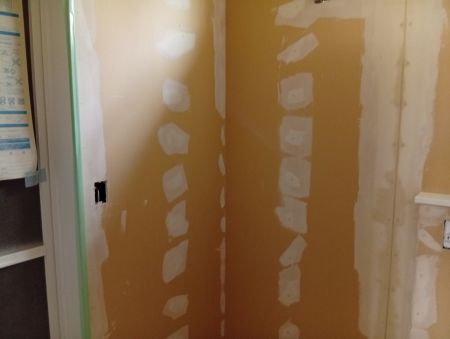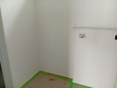 クロスを貼る前に壁下地の表面の段差や凸凹を平滑にするため、ボードのつなぎ目やビスの頭などにパテを塗っていきました。